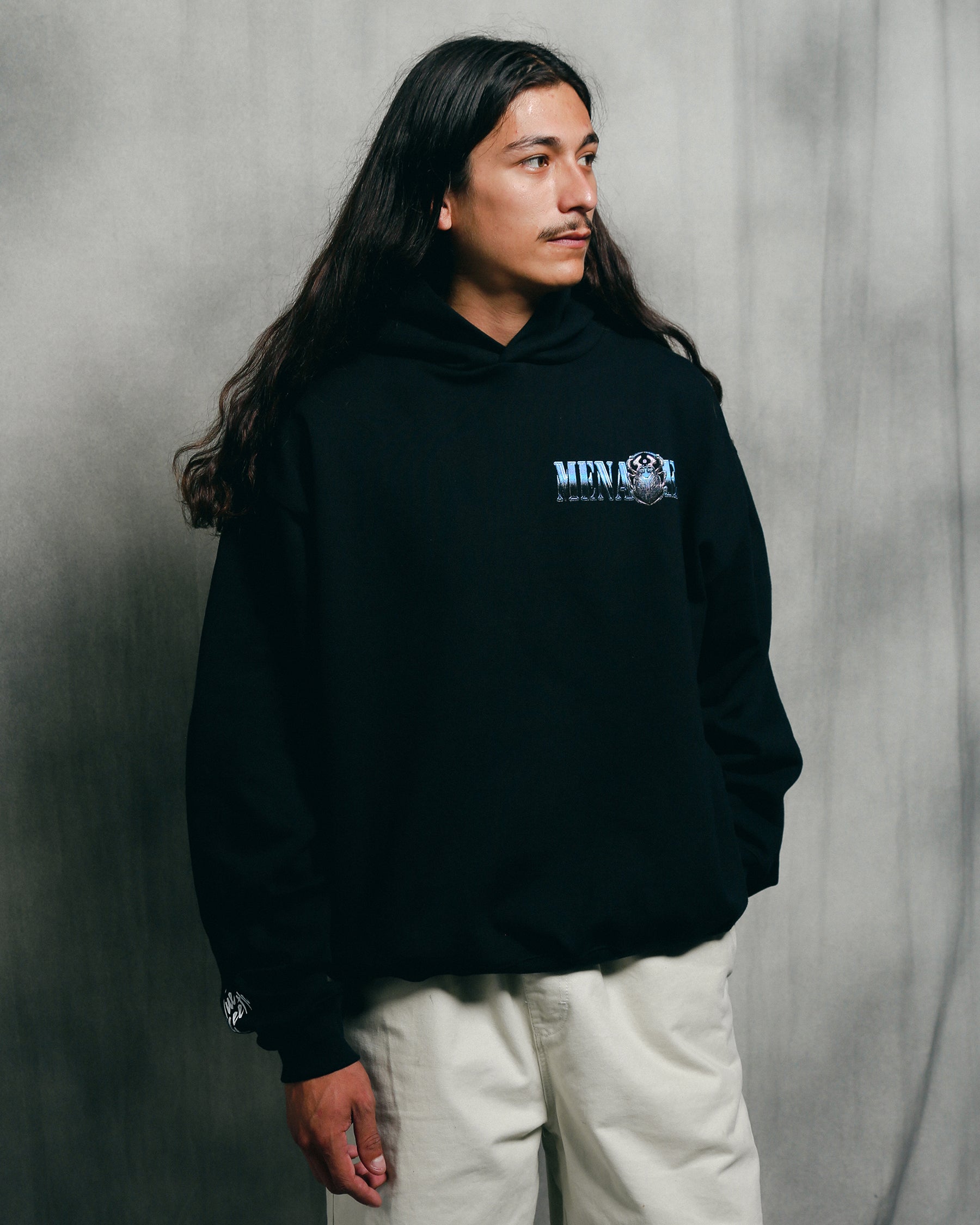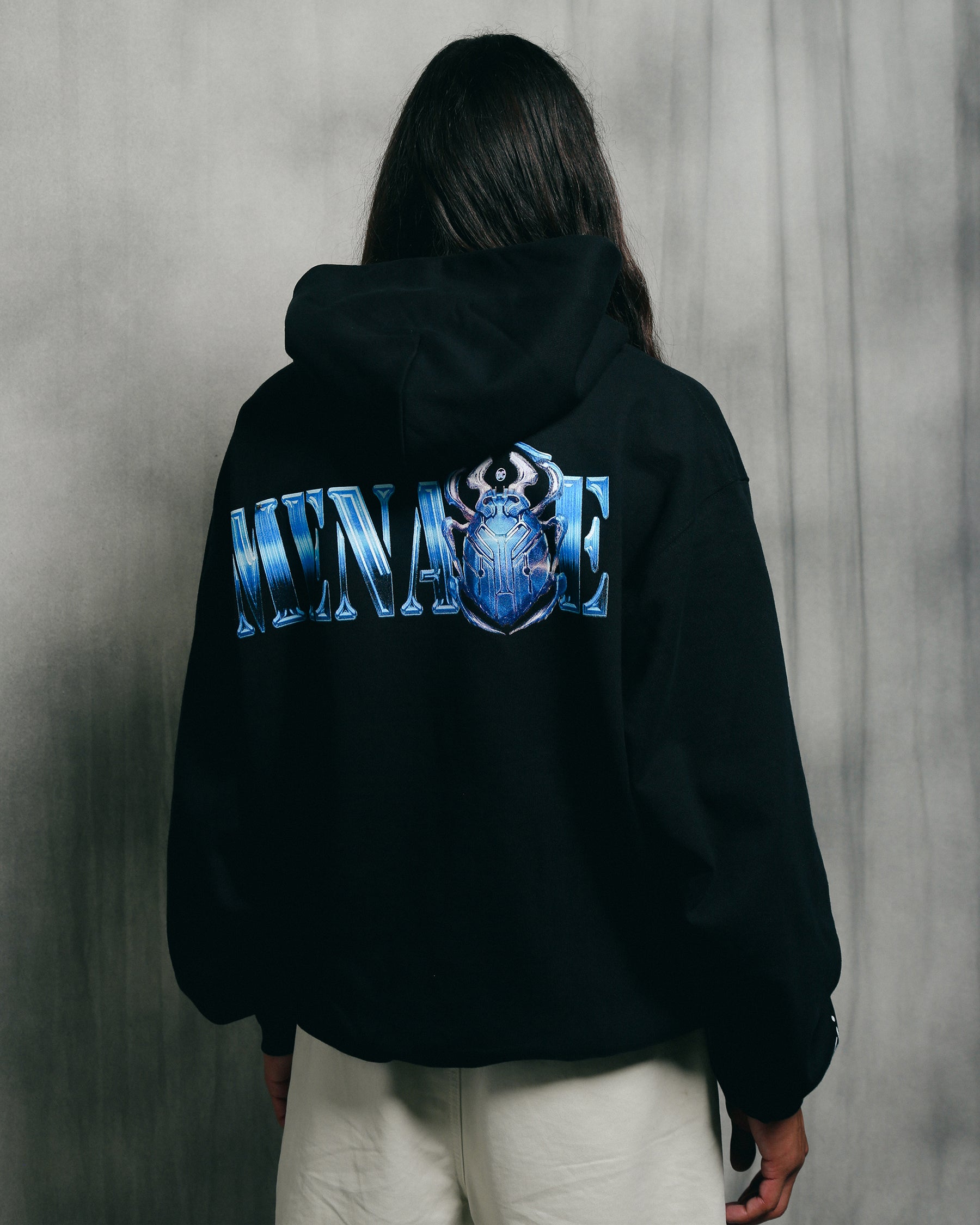 MENACE x Blue Beetle graphic pullover hoodie. Made in collaboration with the DC Comics & Blue Beetle.