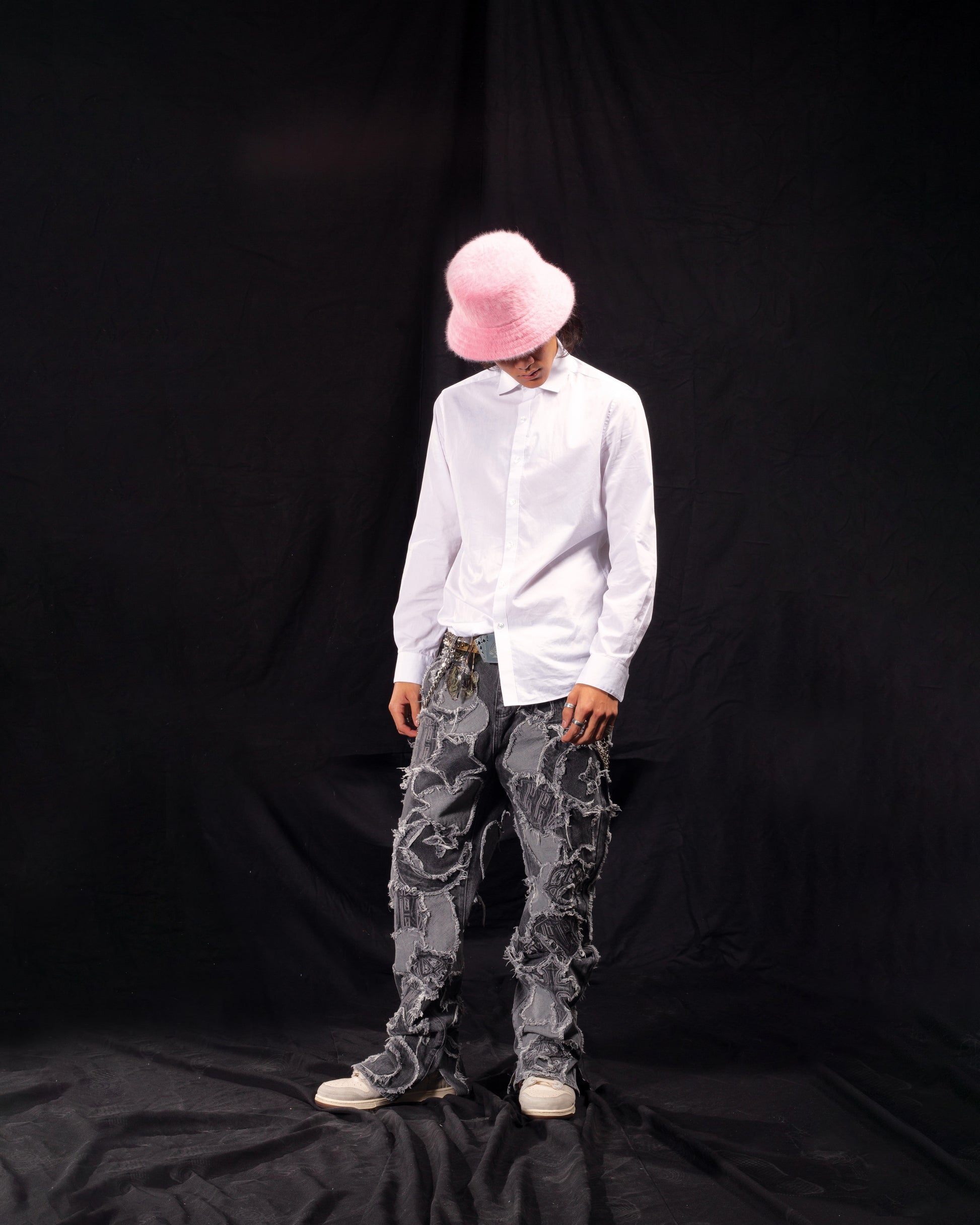 – Distressed denim patchwork detailing.